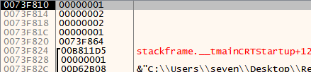 즉, 우리가 찾는 main함수임을 알 수 있다. 이제 main함수를 찾았으니, main의 시작 부분에 bp를 설치하고 실행을 한 후, EBP, ESP 값이 어떻게 변화하는지 관찰해보자. 우선 main()의 함수 시작 시 스택은 다음과 같은 상태이다.