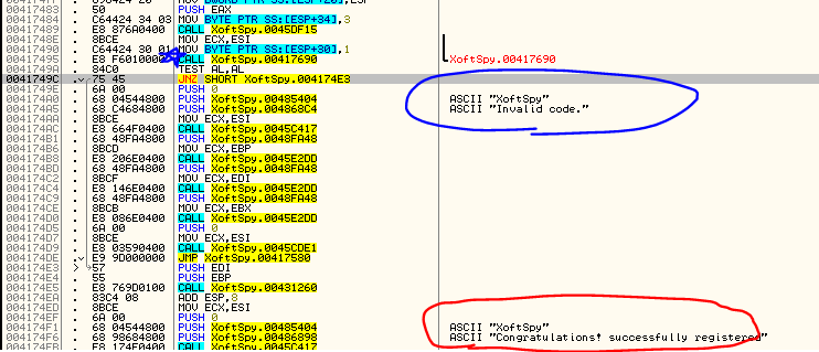 디버깅 위와 같이 근처에 "Contratulations! ..." 문자열이 보이며, "Invalid code." 문자열 위로는 conditional jump 명령어가 보인다. TEST AL, AL의 결과에 따라 나타나는 메시지 박스가 달라지는 듯하다. 함수의 반환 값이 eax 레지스터에 담기므로 00417495 주소의 CALL 명령어에서 eax 레지스터가 세팅될 확률이 높다. 해당 부분에 BP를 설정한 후 프로그램 키 등록을 시도해보자.