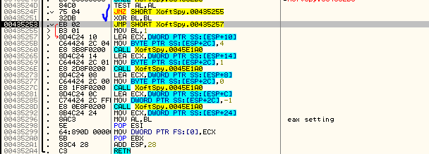 디버깅 F8을 이용해 한줄씩 코드를 실행시키다 보면, 위와 같이 XOR BL, BL을 통해 BL을 0으로 세팅한 후, 00435296에서 MOV AL, BL을 통해 AL 또한 0으로 세팅한다. 체크 표시한 부분의 JMP를 NOP으로 바꿔주어 MOV BL, 1이 실행되게끔 하여 이후에 MOV AL, BL을 했을 때 AL에 1이 세팅되도록 코드를 수정한 후, F9를 눌러 프로그램을 실행해보자.