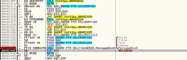 등록 실패 위와 같이 "Invalid code."라는 문자열을 포함한 메시지 박스가 나타난다. MessageBox() API에 BP를 설정한 후 다시 등록을 시도해보자.