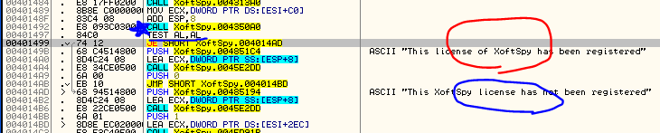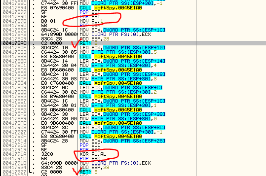 디버깅 첫 번째 동그라미에서는 MOV AL, 1을 통해 1이 세팅되고, 두 번째 동그라미에서는 XOR AL, AL을 통해 0으로 세팅한 후 함수가 retn을 통해 종료된다. 함수의 시작 부분부터 F8을 이용해 한 줄씩 실행시키면서, 첫 번째 동그라미 너머로 점프하는 코드들을 전부 NOP으로 변경해준 후 함수를 빠져나와보자.