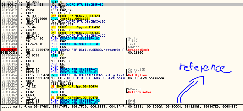 디버깅 위와 같이 BP에 적중한다. 이 상태에서 F8을 눌러 메시지 박스를 실행하면 곧 바로 "Invalid code." 메시지 박스가 출력된다. 아마도 이미 코드에 대한 검사를 마친 후 단순히 결과를 출력하는 듯하다. 이 함수의 시작 부인 0045C417 주소에 커서를 옮기면 아래와 같이 이 함수가 호출되는 부분을 확인할 수 있다.