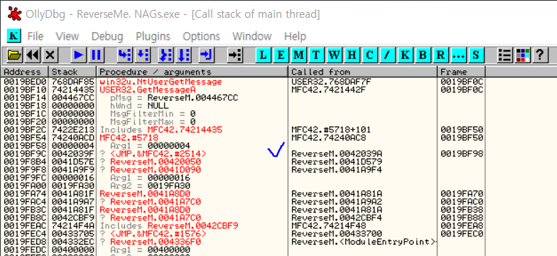 파일을 열고, F9로 실행한 후, 앞의 nag window가 나타나자마자 OllyDbg로 pause를 한 후 call stack을 살펴보자.