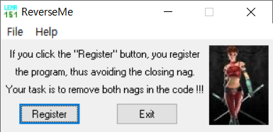 실행화면 1 Windows 10에서는 글자가 잘리는데 XP에서 실행하면 "I'm the starting nag. Remove me"라는 문자열이 보인다. 잠시 기다리면 다음과 같은 창이 나타난다.