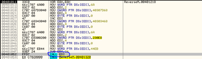 디버깅 현재 EDI 레지스터에는 00401011 주소가 담겨있으며, MOV / ADD 명령어의 반복을 통해 마찬가지로 코드 복호화가 이뤄진다. 동그라미 표시한 CALL EDI까지 실행해보자.