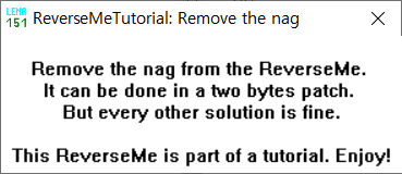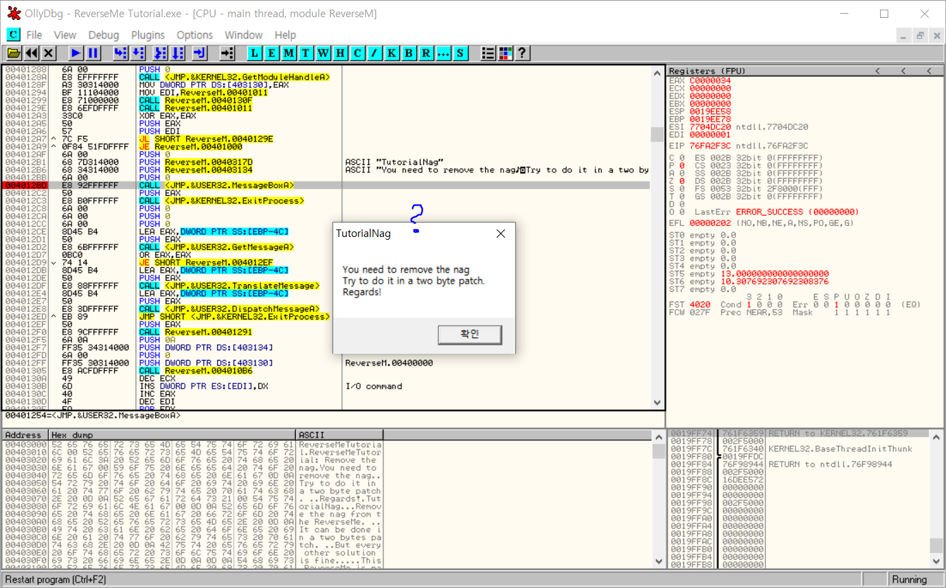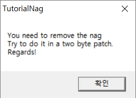 디버깅 위와 같이 지워야 할 Nag 메시지 박스를 호출하는 코드가 나타난다. Nag 박스를 지우기 위해서 메시지 박스가 호출된 직후 Jump 하는 곳으로 호출되기 전에 Jump 하도록 코드를 수정해주면 좋을 것 같다. JMP SHORT 이므로 문제에서 요구하는 two byte patch에도 적합한 방법이다.