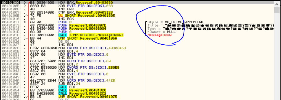 디버깅 무언가 메시지 박스를 호출하는 루틴으로 코드가 변경되었다. 동그라미 표시한 부분을 보면 텍스트가 깨져있는 것을 확인할 수 있다. 코드를 천천히 살펴보면 현 위치(00401000) 아랫부분에서 00403000 영역의 복호화가 이뤄지고 있으며, 메시지 박스의 텍스트들이 해당 영역에 존재하는 것을 파악할 수 있다. 우선 복호화 루프까지 실행시켜보자.