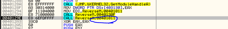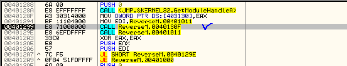 디버깅 GetModuleHandle API를 통해 EAX 레지스터에 ImageBase 값이 저장되고, 403130 주소에 옮긴다. 이후 401299 주소의 CALL ReverseM.0040130F가 호출된다. F7을 눌러 Step in 해보자.