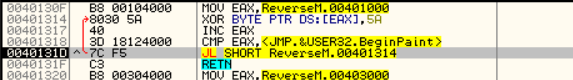 디버깅 위와 같은 loop가 있는 것을 확인할 수 있다. loop에서는 00401000주소부터 00401314 직전까지 한 바이트씩 5A와 XOR 연산을 한다. 이때 해당 영역은 메모리 맵을 통해 .text(code) 영역임을 확인할 수 있다. 즉 XOR 연산을 통해 코드 영역의 일정 부분을 복호화하는 작업을 진행 중인 듯하다. RETN에 BP를 설정하고 넘어가 보자.