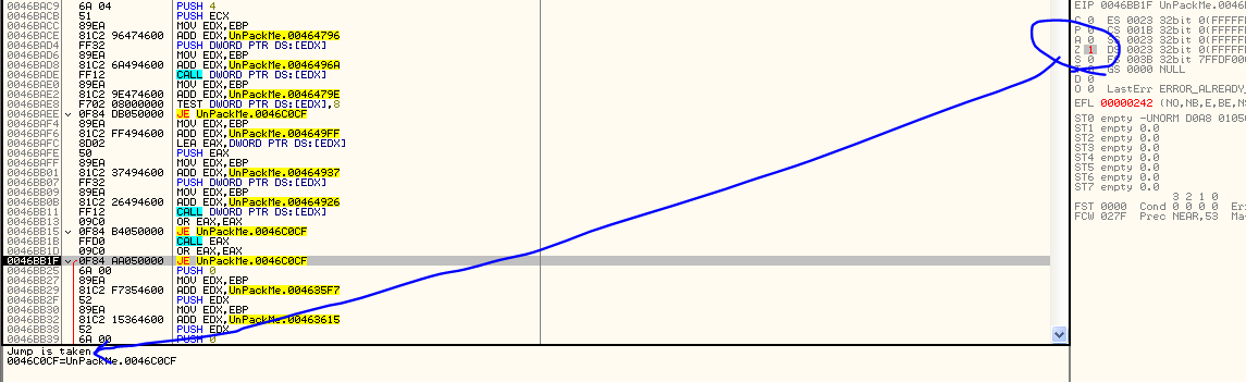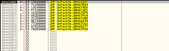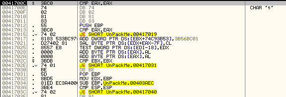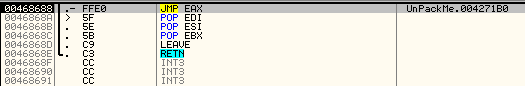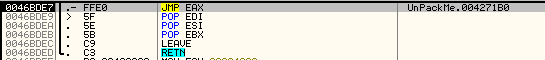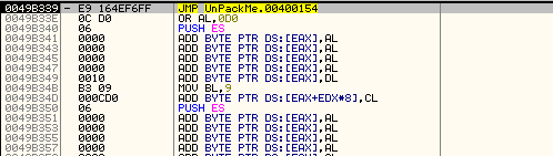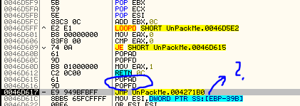 OEP...? 특정 영역으로 점프한다는 점, 점프 명령어가 나오기 직전에 POPAD, POPFD를 통해 레지스터 값을 복원한다는 점에서 OEP로 점프할 것 같다. 점프해보자.