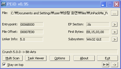 PEiD Crunch 5.0.0 이라는 패커가 이용되었다. OllyDbg로 파일을 열어보자.