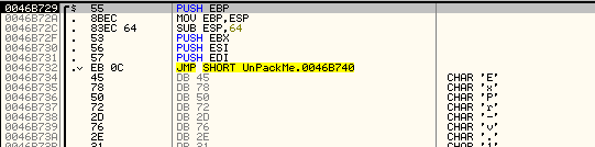 디버깅 위와 같이 바로 PUSH EBP 명령어가 나타난다. 처음에는 해당 명령어가 실행된 직후의 ESP에 하드웨어 BP를 설정해보았지만 OEP를 찾을 수 없었다. 동그라미 친 부분에 PUSH EBP 이후에 PUSHAD, PUSHFD 명령어가 나타나므로 본격적인 디코딩 루틴이 시작되는 부분이라는 것을 짐작할 수 있다. 0046B026 주소의 PUSH EBP가 수행된 직후 ESP에 하드웨어 BP를 설정하고 F9를 눌러 실행해보자.