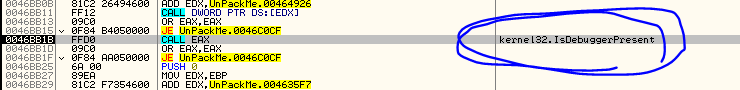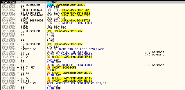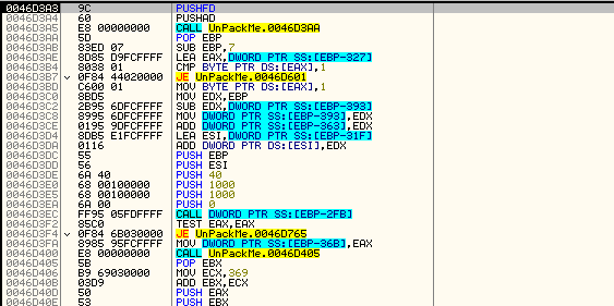 EP 이전과는 달라 보이는 명령어로 코드가 시작된다. PUSHFD, PUSHAD 명령어로 시작하므로 OEP에 들어서기 직전에 레지스터 및 플래그 값을 복원하기 위해 POPAD, POPFD 명령어가 나타나리라 예측하고 탐색을 해보았지만 명령어들이 인식되지 않았다. 아마도 디코딩 루틴 과정에서 모든 디코딩이 끝났을 때 해당 명령어들이 드러나는 방식인 듯하다. 어쩔 수 없이 F8을 이용해 트레이싱하다 루프를 만나게 되면 이후 명령어에 BP를 설정하는 방식으로 코드를 트레이싱 하다 보면 다음과 같은 곳에 도달할 수 있다.
