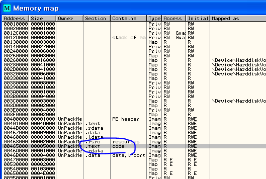 EP 위와 같이 코드가 46B6DE 주소에서 시작하는 것을 확인할 수 있다. 무언가 시작 주소가 이상하다. 메모리 맵을 통해 어느 영역에 있는 것인지 확인해 보자.