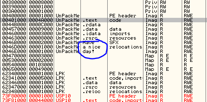 메모리 맵 위와 같이 특이하게 .text / .rdata / .data 영역이 2개씩 있는 것을 확인할 수 있다. 우선 실행 화면은 두 번째 .text 영역에 나타나는 것을 확인할 수 있다. F8을 눌러 첫 번째 명령어가 가리키는 영역으로 점프해보자.