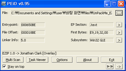 PEiD EZIP 1.0이라는 패커를 이용해 실행 압축된 것을 확인할 수 있다. OllyDbg로 파일을 열어보자.