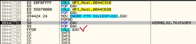 BP 적중 체크 표시한 부분의 CALL EAX 명령어를 통해 OEP로 흐름이 넘어갈 것 같다. 해당 부분까지 step in 해보자.