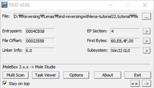 PEiD MoldBox 2.x.x 라는 패커로 패킹되었다. 언패킹을 하기 위해 OllyDbg로 파일을 열어보자.