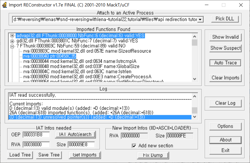 ImpRec OEP를 맞춰주고, IAT AutoSearch를 한 후, Get Imports로 함수들을 읽어 들였다. 하지만 보이다시피 unresolved pointer가 있다고 나타난다. 무언가 문제가 있다는 뜻이다. Show Invalid 버튼을 눌러 문제가 있는 곳을 살펴보자.
