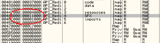 ImpRec rva : 00038040에 00458C35가 저장되어 있는 것을 확인할 수 있다. 무언가 이상하다. 보통 dll로부터 import 되는 함수들의 주소는 7XXXXXXX로 시작한다. OllyDbg에서 Memory map을 통해 해당 주소가 어느 섹션을 가리키는지 확인해보자.