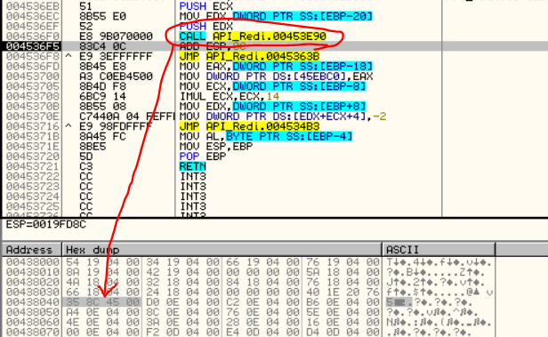디버깅 3 동그라미 표시한 CALL 명령어가 수행된 직후에 값이 바뀌는 것을 확인할 수 있었다. 함수 내부로 step in 해서 바뀌는 순간을 더 분석하는 방법도 있겠지만, 여기서는 CALL 명령어를 NOP 처리하고 OEP까지 도달한 후, ImpREC로 확인해보았을 때 문제가 발생하는지 확인해보겠다. 우선 다시 실행하여 "디버깅 1"까지 실행한 후, 동그라미 친 부분을 NOP 처리하고 F9를 통해 OEP까지 도달해보자.
