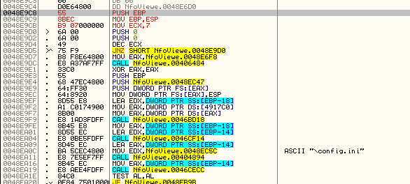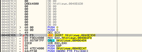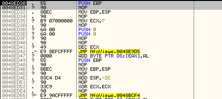 점프 영역 점프 영역 위의 PUSH 0 명령어 위로 8 byte 만큼 비어 있는 것을 확인할 수 있다. 이 8 byte는 처음에 OEP로 추정되었던 부분의 앞의 8byte 명령어인 PUSH EBP / MOV EBP, ESP / MOV ECX, 7이 stolen 된 부분이라고 생각해볼 수 있다. 48E9C8 주소에 위 세 명령어들을 입력해보자.