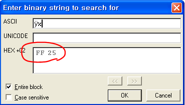 empty 위와 같이 아무런 값도 입력되어 있지 않다. 패커가 IAT 수정을 방해하기 위해 뭔가 작업을 해놓은 듯 하다. IAT를 찾기 위한 또 다른 방법으로 명령어를 탐색하는 방법이 있다. IAT를 이용하기 위해 항상 JUMP DWORD PTR DS:[xxxx] 형태의 명령어가 실행되는데 명령어의 상위 2byte는 FF25로 시작한다는 점에 착안해 FF25에 대해 binary string search를 해보자.